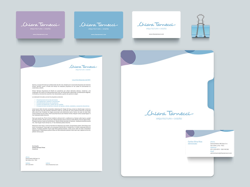 Chiara Tarnecci es una marca nueva del sector Diseño – Arquitectura que ya contaba con un logotipo definido pero le faltaba desarrollar una línea de diseño propia que sea identificable y coherente con la filosofía de la marca. Para ello se desarrollaron las piezas básicas de uso diario.