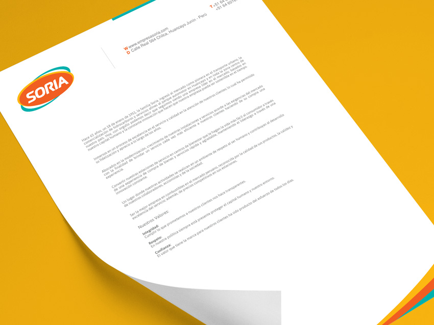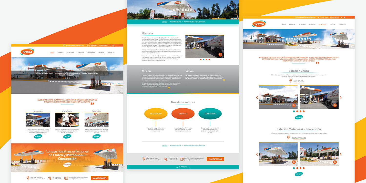 Empresa Soria y Cía S.A. se encuentra ubicada en la ciudad de Huancayo – Perú con experiencia en el mercado de combustibles y con estaciones propias en las ciudades de Huancayo y Jauja. Por tal motivo se decide evolucionar su Identidad Visual dejando como color principal y diferenciador el naranja, a su vez se cambia la forma circular por una elipse haciéndola más ágil y elaborando las Aplicaciones de Marca en diversas piezas de comunicación, ya sean impresas o digitales.